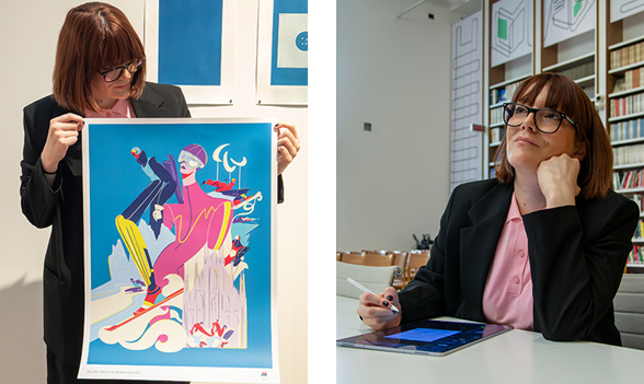 Olimpia Zagnoli cattura l’essenza dei Giochi, l’energia e la personalità di chi li vive, sublimando il dna della città e della natura, di Milano e di Cortina. L’utilizzo di un linguaggio immediato e vibrante crea una visione ironica e simbolica. Il poster diventa così un emblema dello spirito Olimpico: uno sguardo aperto sul mondo che celebra con entusiasmo le diversità servendosi di elementi che raccontano e rappresentano ognuno di noi.