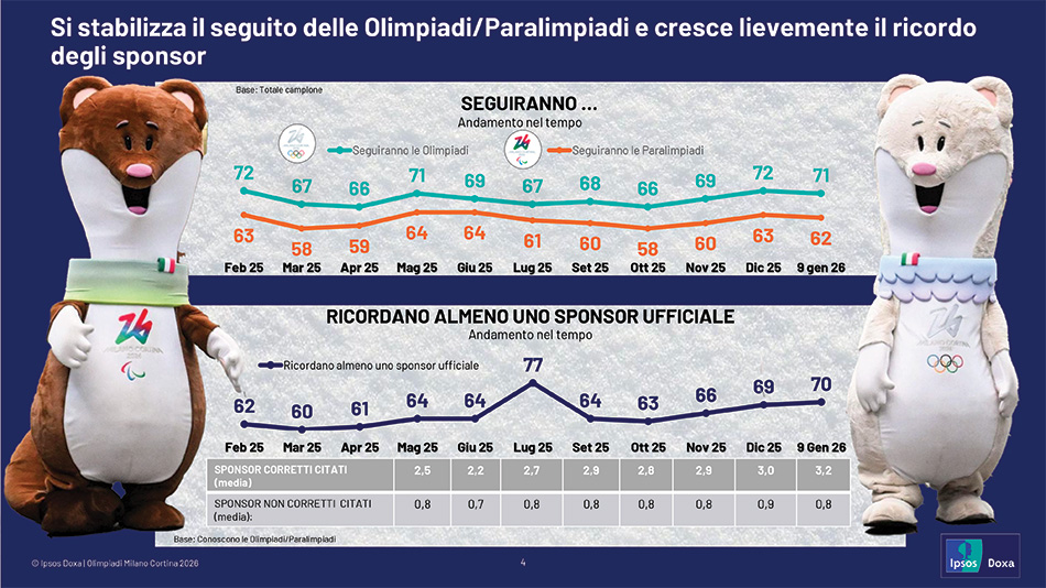 L’intenzione di seguire l’evento si mantiene stabile, con il 71% degli italiani che dichiara di seguire le Olimpiadi. Parallelamente, cresce lievemente anche il ricordo degli sponsor ufficiali, che raggiunge il 70% tra chi conosce l’evento, con una media di 3,2 sponsor correttamente citati.