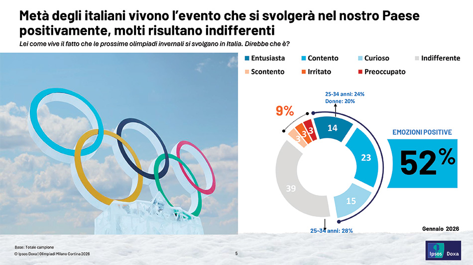 Sul piano emotivo, oltre la metà degli italiani (52%) vive positivamente l’appuntamento olimpico nel nostro Paese: il 23% si dichiara contento, il 15% curioso e il 14% entusiasta. L’entusiasmo risulta particolarmente marcato nella fascia 25-34 anni (24%) e tra le donne (20%). Resta tuttavia una quota significativa di indifferenti (39%), meno presente tra i giovani adulti 25-34 anni (28%).